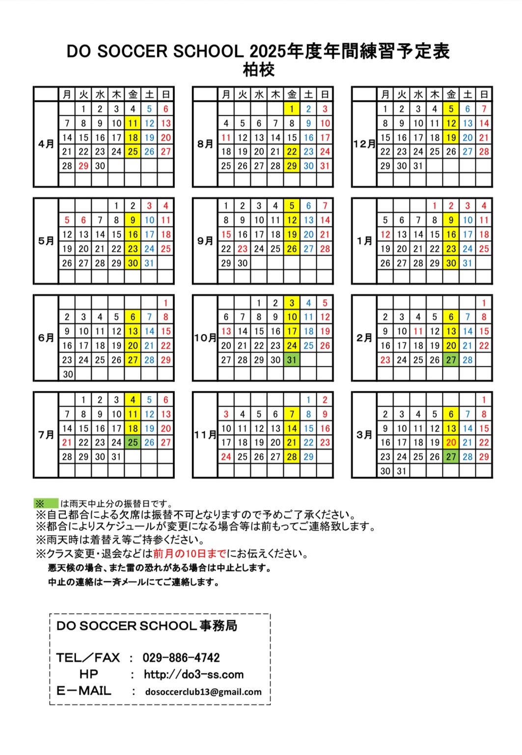 基本的には雨天決行ですが、大雨、雷、台風などの際は中止となります。(各スクール会場のコート使用基準によって多少基準が異なります。)中止の際はメーリングリスト、お電話にてご連絡致します。